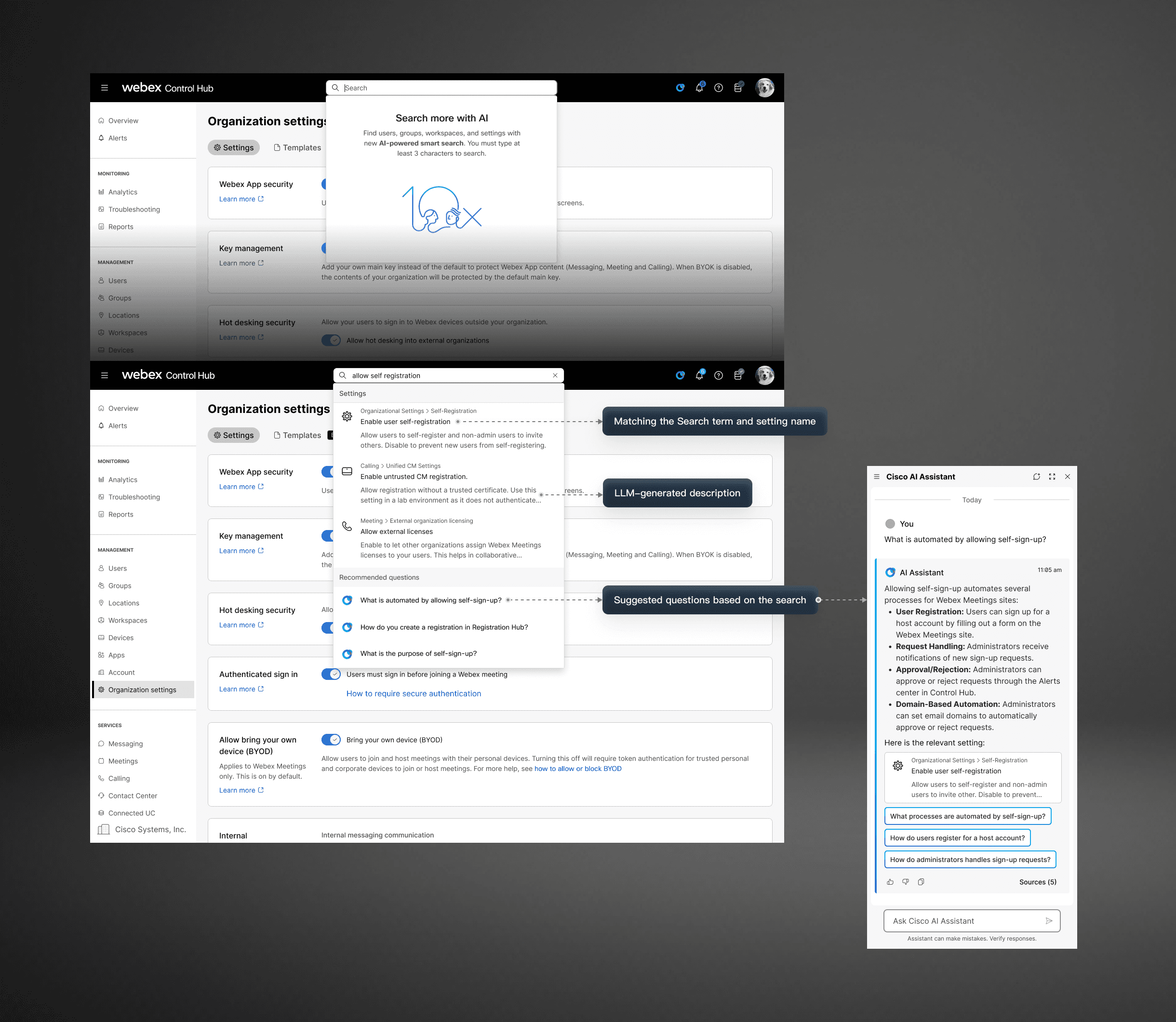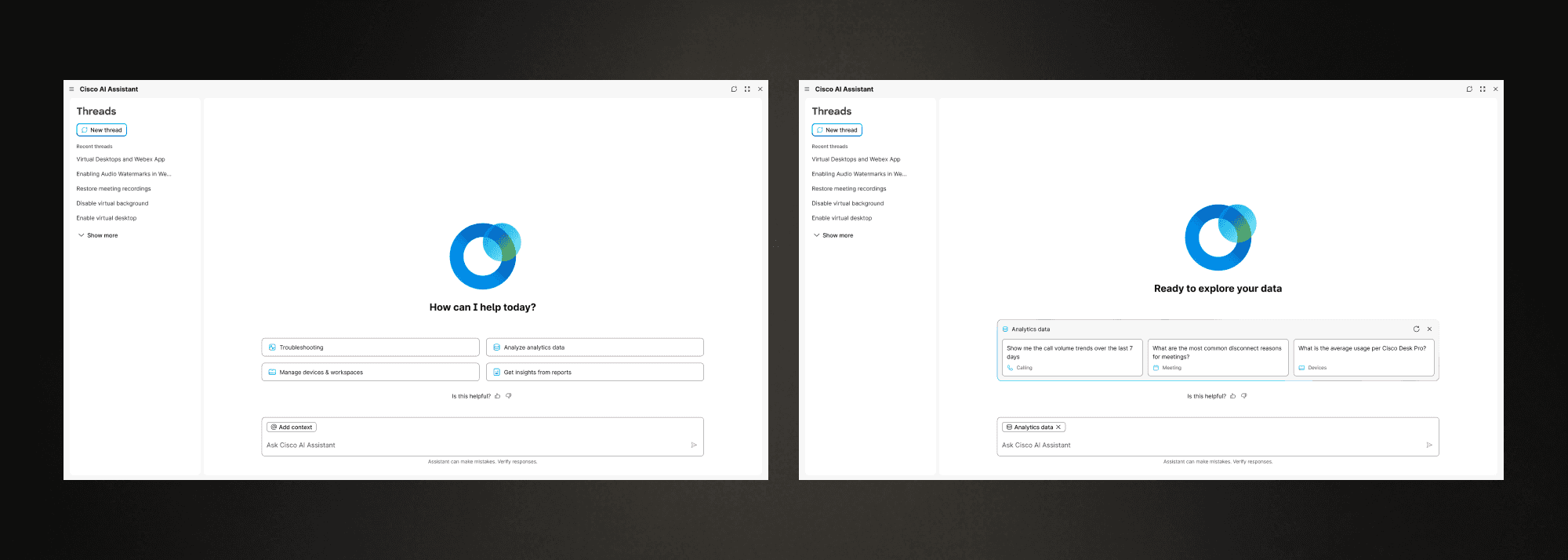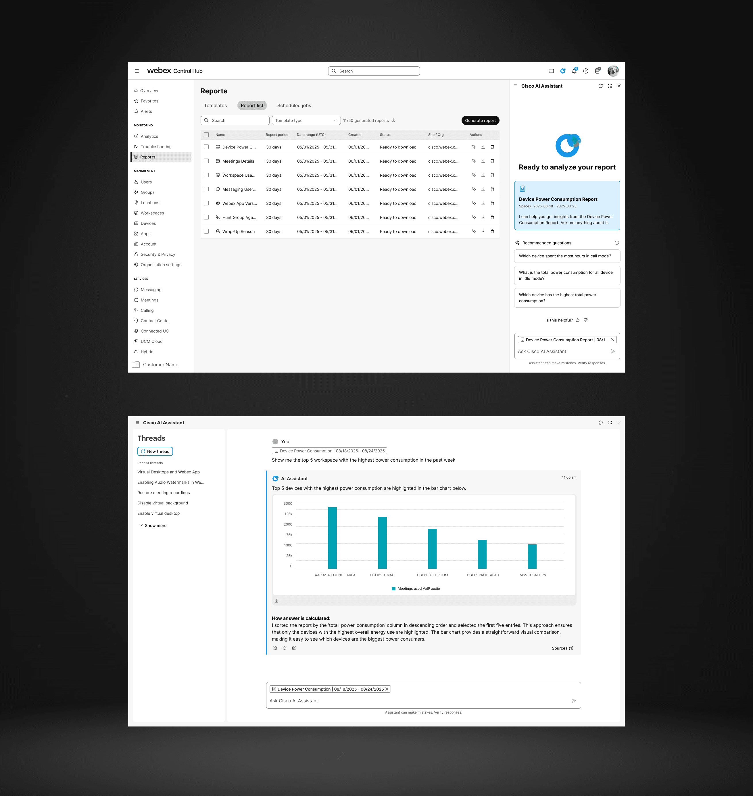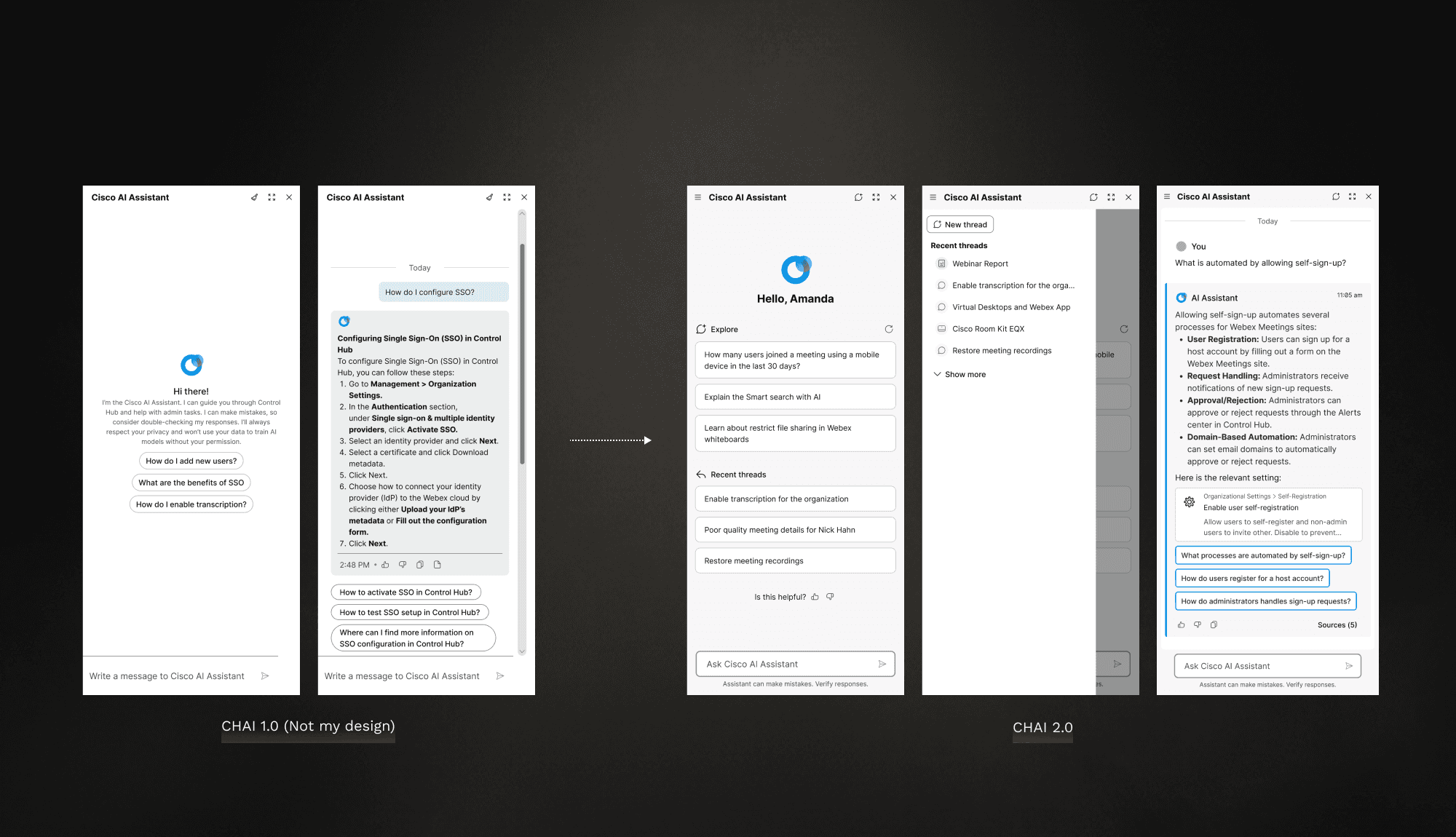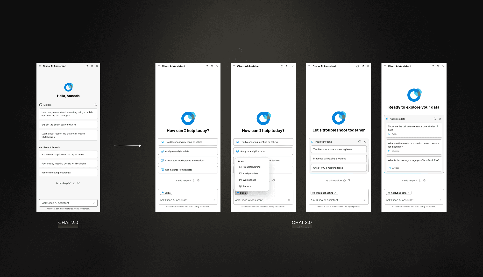 I led the evolution of Webex Control Hub’s AI Assistant from a simple help bot into a full conversational layer—adding threaded chats, Smart Search, and AI-powered report analysis—which boosted monthly usage by 120%, proving that thoughtful system-level design can directly drive efficiency and adoption.