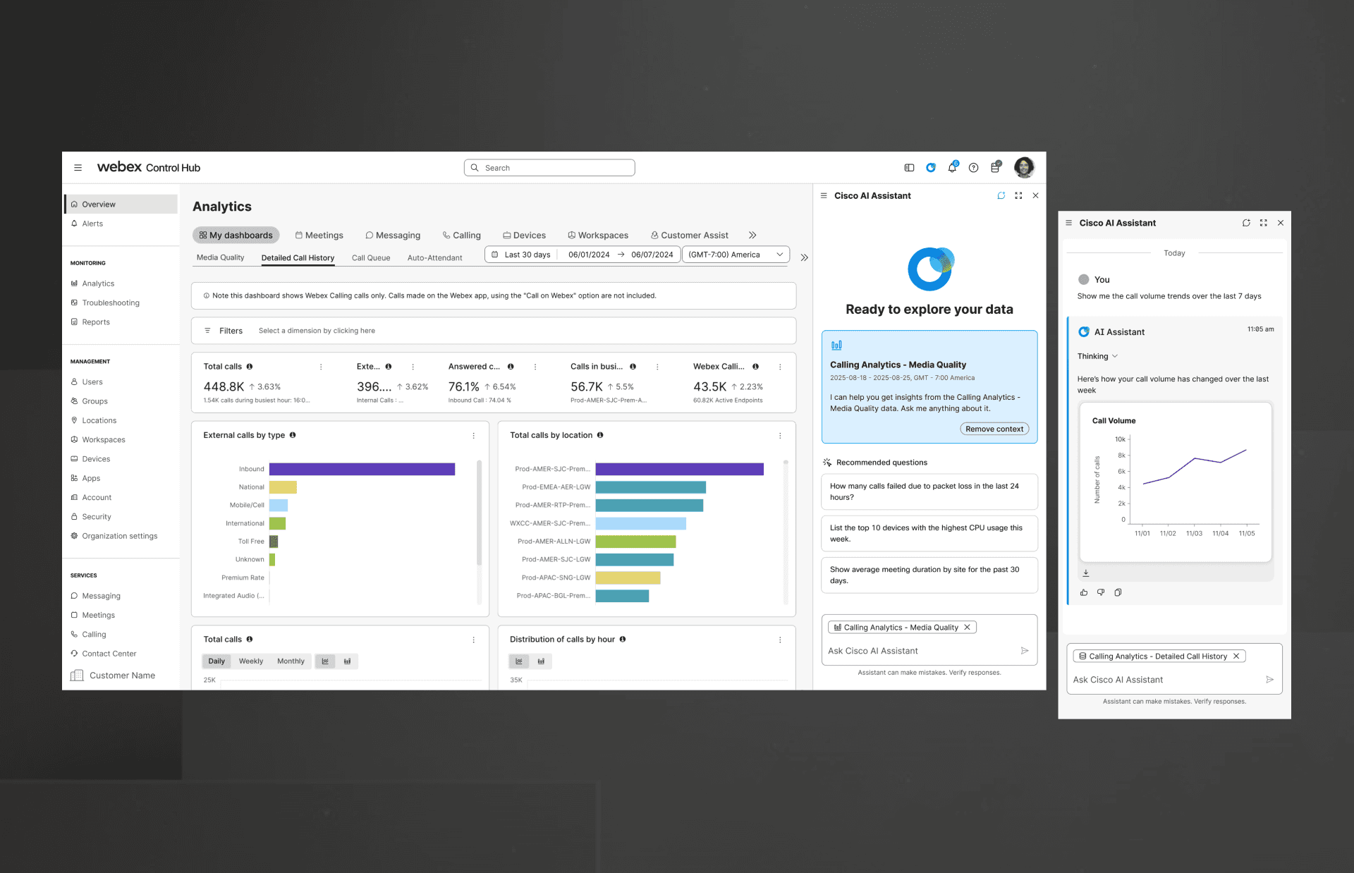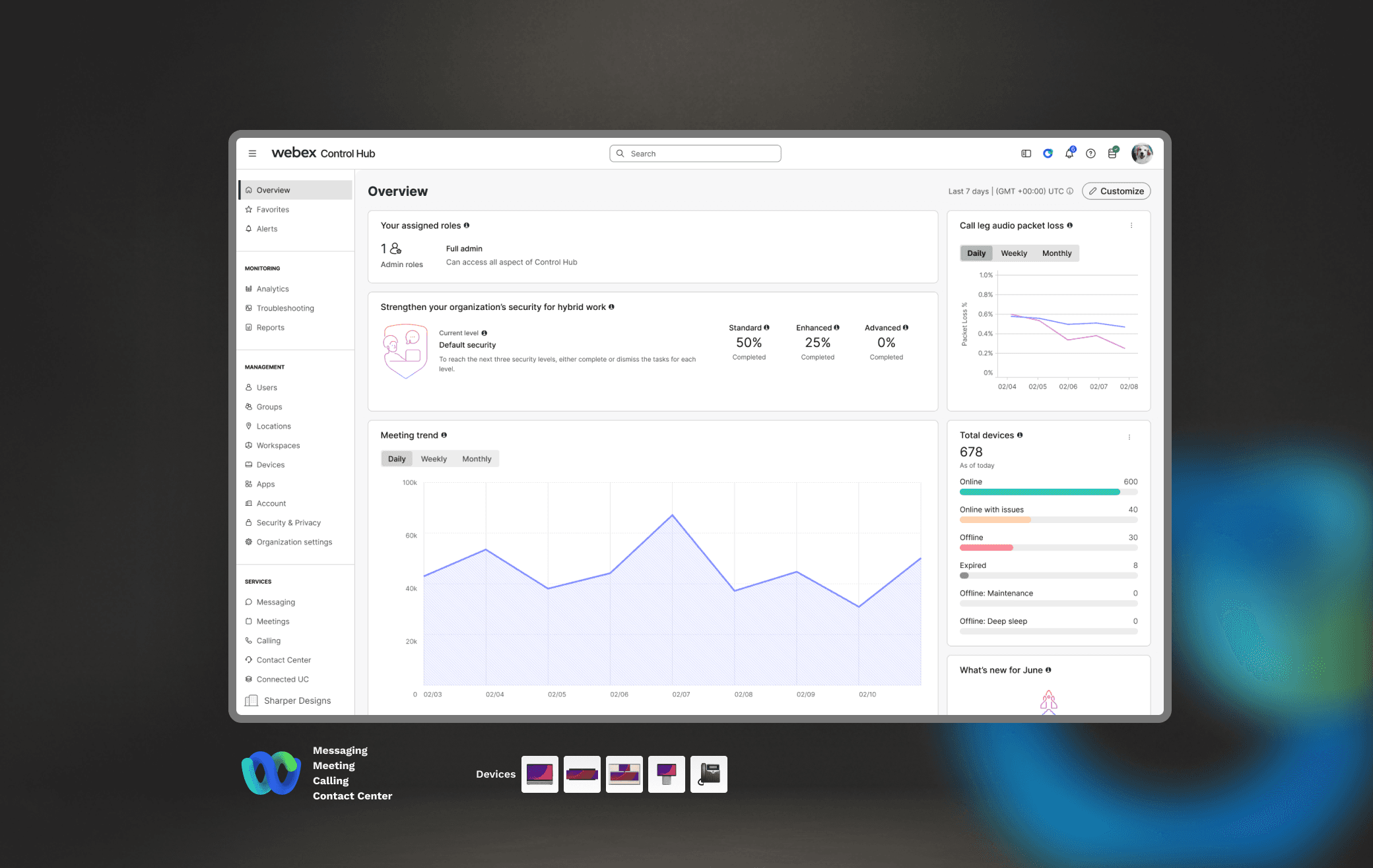 Webex Control Hub is the single pane of glass where IT administrators deploy, configure, and monitor the entire Webex Suite—Messaging, Meetings, Calling, and Contact Center.